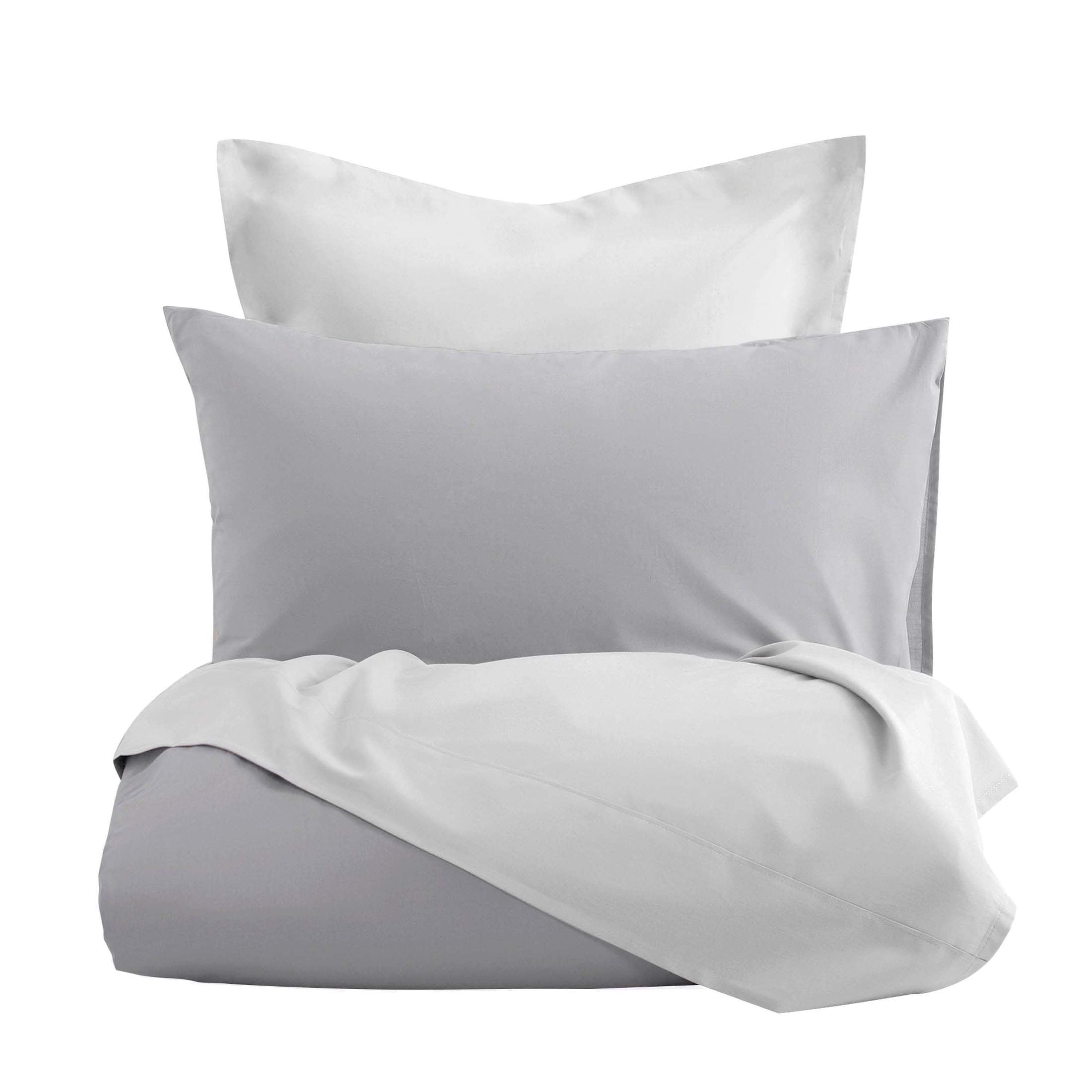 Dieser schlichte Bettbezug in Hellgrau und Weiß besteht aus gebürsteter Flanell-Baumwolle. Durch das Aufrauen des Gewebes entsteht eine feine, flauschige Schicht, die sich wunderbar weich auf der Haut anfühlt.