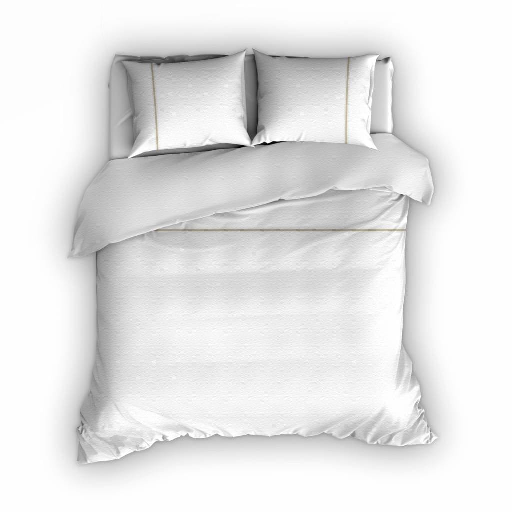La housse de couette en flanelle 'Duchesse' est disponible en plusieurs combinaisons de couleurs. Il s'agit d'une parure de lit entièrement unie avec une ligne d'accent en haut de la housse et sur les taies d'oreiller. La version est en blanc avec un accent beige.