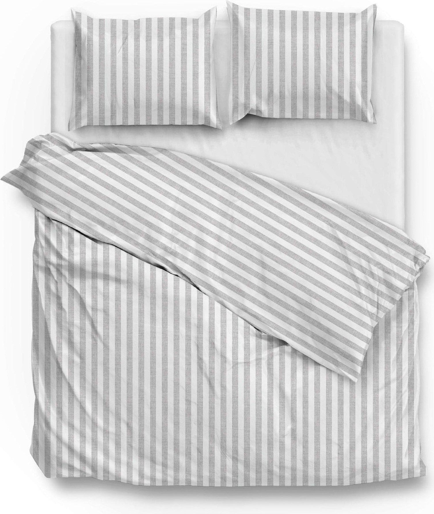 Housse de couette Banda di Lino Gris Tourterelle. Parure de lit complète de la marque tendance Zo Home. Dotée d'une bande de draps extra-longue et ouverte, elle arbore un motif rayé traditionnel gris tourterelle. Cette housse de couette classique à rayures blanc-gris est confectionnée en coton doux et lisse. Elle vous garantit un sommeil confortable et crée une ambiance apaisante et chaleureuse. Élégante, elle s'harmonisera facilement avec n'importe quelle chambre.