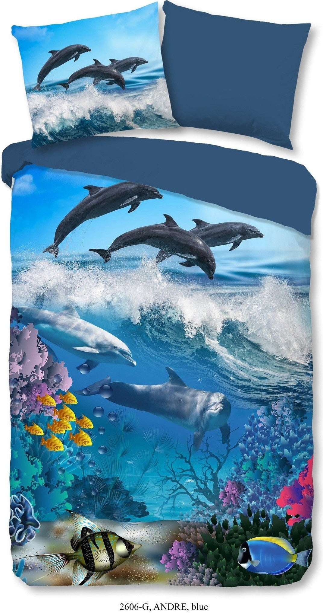 Kinderdekbedovertrek "Andre" van Good Morning met dolfijnen, in de kleur "Blauw" is gemaakt van 100% katoen. Deze kwaliteit is ademend, vochtabsorberend en voelt zacht en soepel aan. Dit leuke kinderdekbedovertrek is een toevoeging aan iedere kinderkamer en is geschikt voor ieder jaargetijde. Het katoenen dekbedovertrek is heerlijk koel in de zomer en geeft warmte in de winter.
