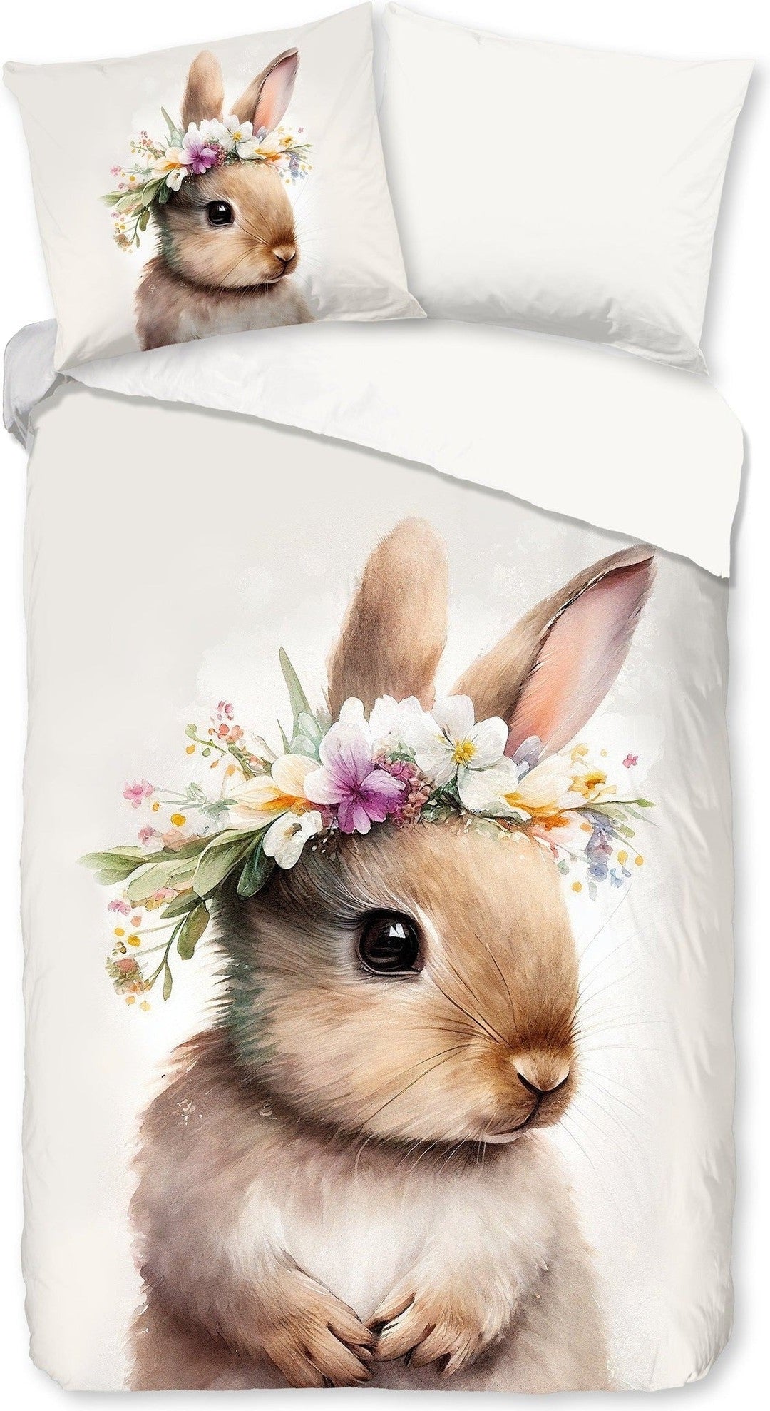Kinderdekbedovertrek "Evi" van Pure met konijn met bloemen, in de kleur "Wit" is gemaakt van 100% polyester/microfiber. Het is een prettige stof, dat soepel om je heen valt en ook nog eens licht van gewicht is. Dit leuke kinderdekbedovertrek is een toevoeging aan iedere kinderkamer! Het kinderdekbedovertrek is geschikt voor ieder jaargetijde en door de lichte glans heeft het een luxe uitstraling. Na het wassen is deze stof snel droog en kreukt niet tot nauwelijks waardoor strijken (vrijwel) niet nodig is.