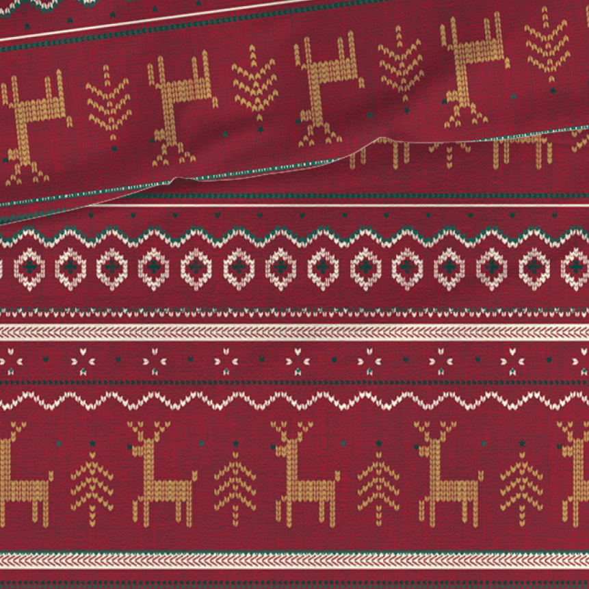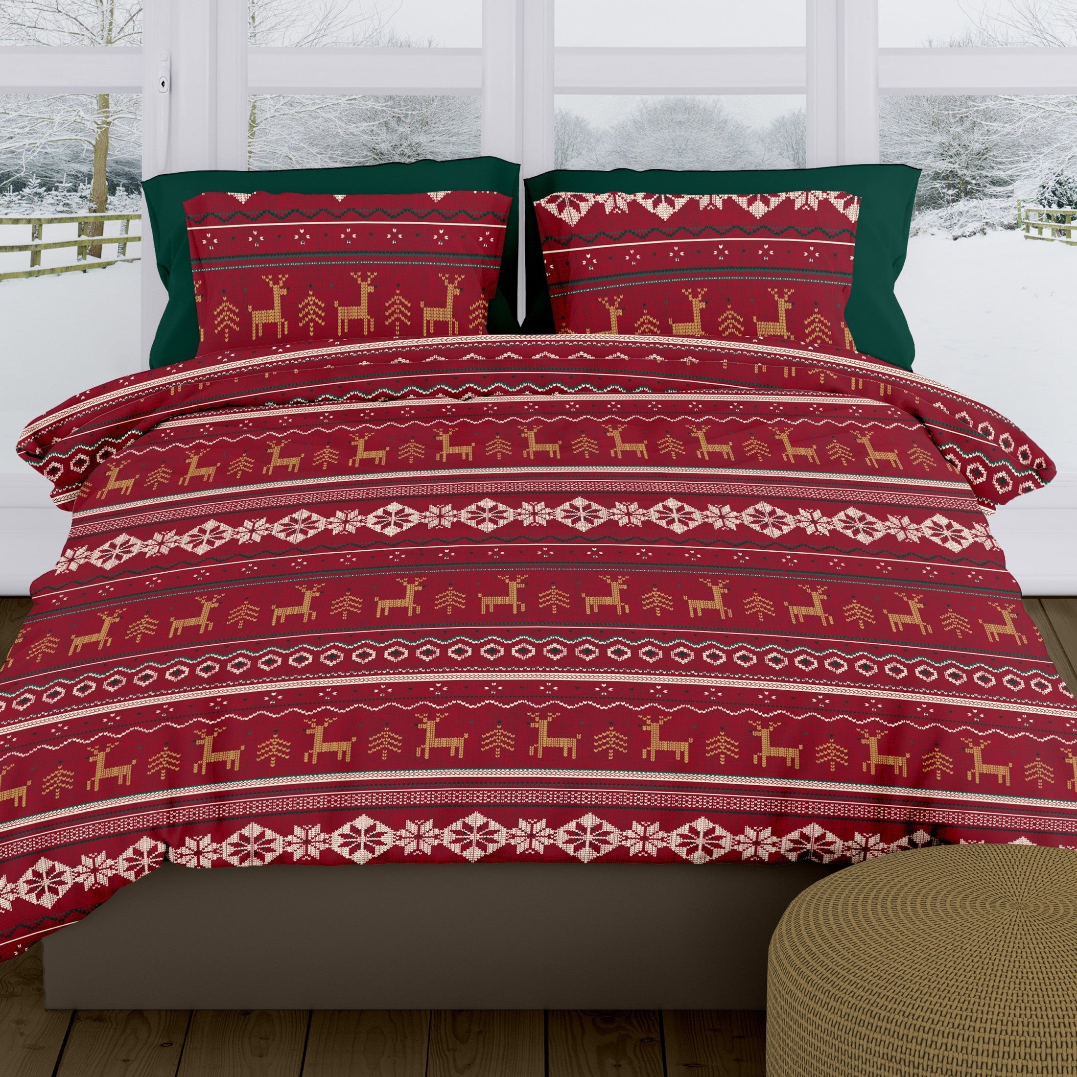 Breng de winterse sfeer in je slaapkamer met het Romanette Noelle flanellen dekbedovertrek. Het rode ontwerp is versierd met verschillende winterse motieven, waaronder banen met rendieren, dennenbomen en ijskristallen, die perfect passen bij het seizoen. Het kleurenschema van rood, wit, groen en goud zorgt voor een warme kerstsfeer in de kamer.